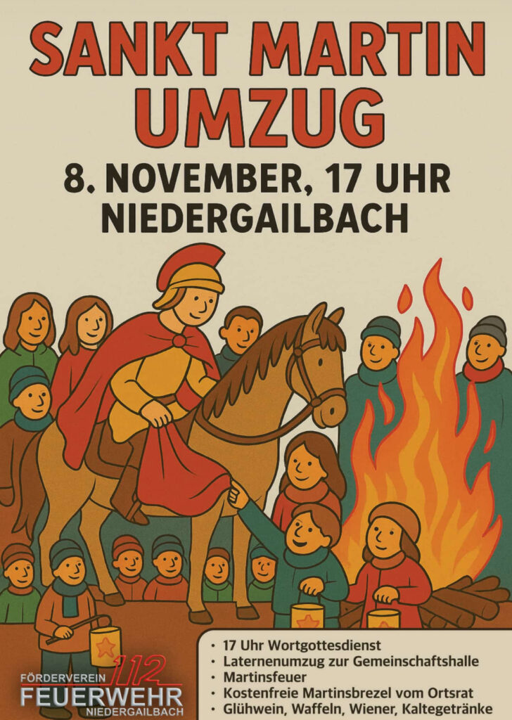 Am Samstag, den 08. November 2025 findet in Niedergailbach das traditionelle St. Martinsfest statt. Es beginnt mit einem Wortgottesdienst in der Bruder-Klaus-Kirche in Niedergailbach. Für die feierliche Atmosphäre während des Gottesdienstes sorgt das Blockflötenquartett Niedergailbach. Nach dem Gottesdienst findet dann der St. Martinsumzug durch Niedergailbach statt. Geführt von St. Martin auf dem Pferd und der Feuerwehr Niedergailbach mit musikalischer Unterstützung der Musikkapelle Niedergailbach ziehen wir durchs Dorf bis zur Gemeinschaftshalle, wo wir uns am St. Martinsfeuer aufwärmen können. Dort bekommen alle anwesenden Kinder ihre Martinsbrezel, welche wieder vom Ortsrat bereit gestellt werden. In der Gemeinschaftshalle gibt es Glühwein, Waffeln mit Sahne/Kirsche, Wiener mit Brot und diverse Kaltgetränke.