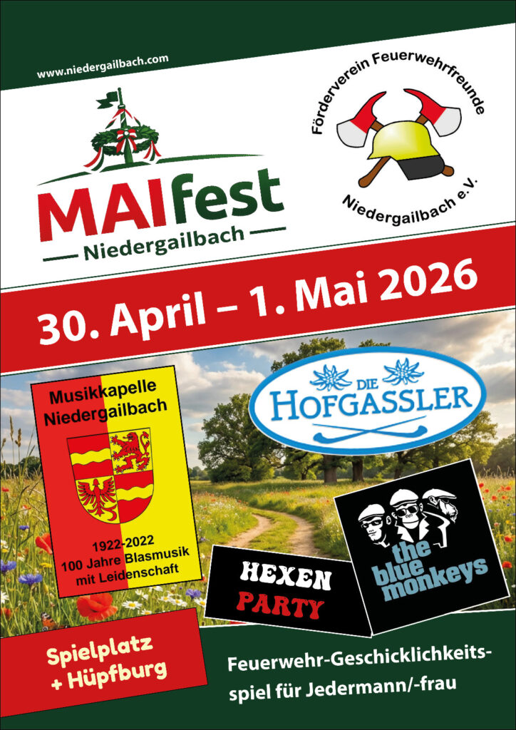 Der erste Mai beginnt bereits um 10:00 Uhr mit dem Frühschoppen. Da kann man sich gleich schon mal auf das nächste musikalische Highlight vorbereiten. Die „Musikkapelle Niedergailbach“ ,mit ihren sieben Musikanten, sorgt ab 11:00 Uhr für beste Stimmung auf dem Festplatz. Zum Mittagessen ab 12:00 Uhr gibt es Gulaschsuppe oder Dürüm vegetarisch gefüllt. Zwischenzeitlich werden wieder einige Feuerwehrfahrzeuge ausgestellt. Der beliebte selbst gebackene Kuchen wird ab 13:00 Uhr in der angrenzenden Gemeinschaftshalle angeboten. Wer will kann ab 13:30 Uhr an einem Feuerwehrspiel teilnehmen. Hier gibt es auch 3 Hauptpreise, welche ab 17:00 Uhr verteilt werden.